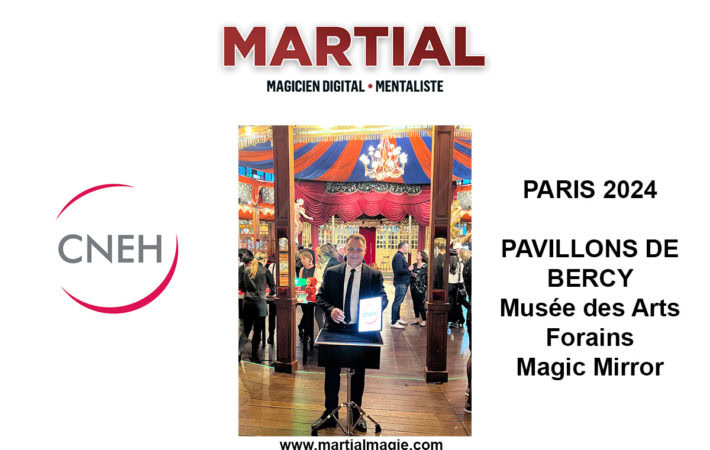 Soirée magique organisée par le CNEH au Pavillons de Bercy à Paris dans le magnifique lieu Magic Mirror. La prestation en  déambulation a permis à Martial de présenter un show exceptionnel parmi les groupes. 70 collaborateurs de la société ont été enchanté par ses performances. Magie digitale et mentalisme au programme pour faire participer le public. Close-up magie digitale pour le CNEH à PARIS avec Martial magicien professionnel disponible dans toute la France.