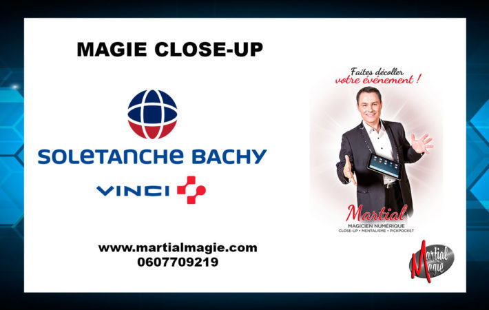 Une soirée autour de la magie close-up avec un magicien mentaliste. Martial est un professionnel qui a diverti 200 invités autour d’un Open Bar. Magicien close-up pour SOLETANCHE BACHY avec Martial magicien professionnel. Une animation magie interactive choisie par la société SOLETANCHE BACHY avec des expériences surprenantes. c’est un magicien stupéfiant qui a obtenu un énorme succès auprès d’un public dynamique. Magicien close-up pour SOLETANCHE BACHY avec un artiste exceptionnel. D’ailleurs le public fut époustouflé et les invités ne sont pas près d’oublier ce magicien mentaliste. La magie est personnalisable pour tous types d’événements. Elle intègre de l’objet et des visuels en rapport avec la thématique de l’entreprise ou un lancement de nouveau produit. La société a fait un excellent choix, Martial a présenté une expérience au cours de laquelle il sort d’une enveloppe cachetée la photo du client, énorme surprise le public était stupéfait par la performance.