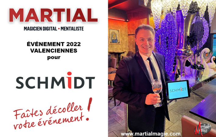 Le magicien comme animation est l’idée parfaite pour agrémenter votre événement. Martial fut le Magicien mentaliste à Valenciennes pour SCHMIDT ce 25 février 2022. Il est intervenu parmi les invités lors d’un dîner. Martial magicien close-up a bluffé le public avec sa magie moderne. D’ailleurs il vous propose d’intervenir pour vos prochains événements. Que ce soit pour un congrès un séminaire ou un lancement de produit il vous proposera une prestation adaptée. Par ailleurs il interviendra également sur scène pour un show totalement interactif avec le public.